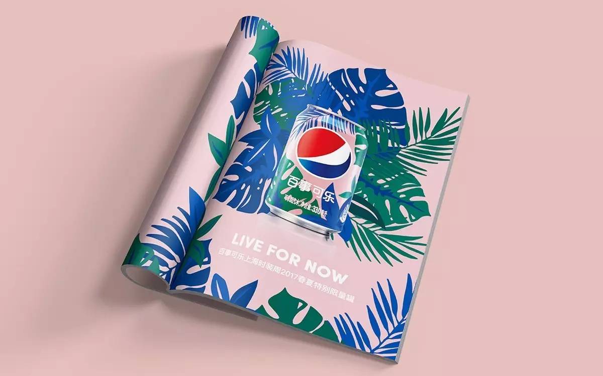 這款限量版包裝是百事可樂(lè)為“LIve for Now”精神與上海時(shí)裝周特別設(shè)計(jì)的,在以往的海洋藍(lán)中大量加入粉色,加上大面積熱帶的棕櫚葉,喚起了春夏的氛圍,輕松又活潑。
